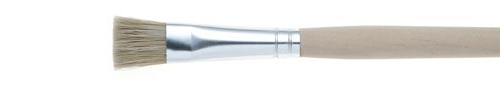 Gussow-Pinsel in der Größe 20. Flachgedrückte Zwinge ca. 21 mm breit, mittellange reine Borsten, sichtbare Borstenlänge ca. 23 mm, roher Stiel, Gesamtlänge ca. 31 cm.